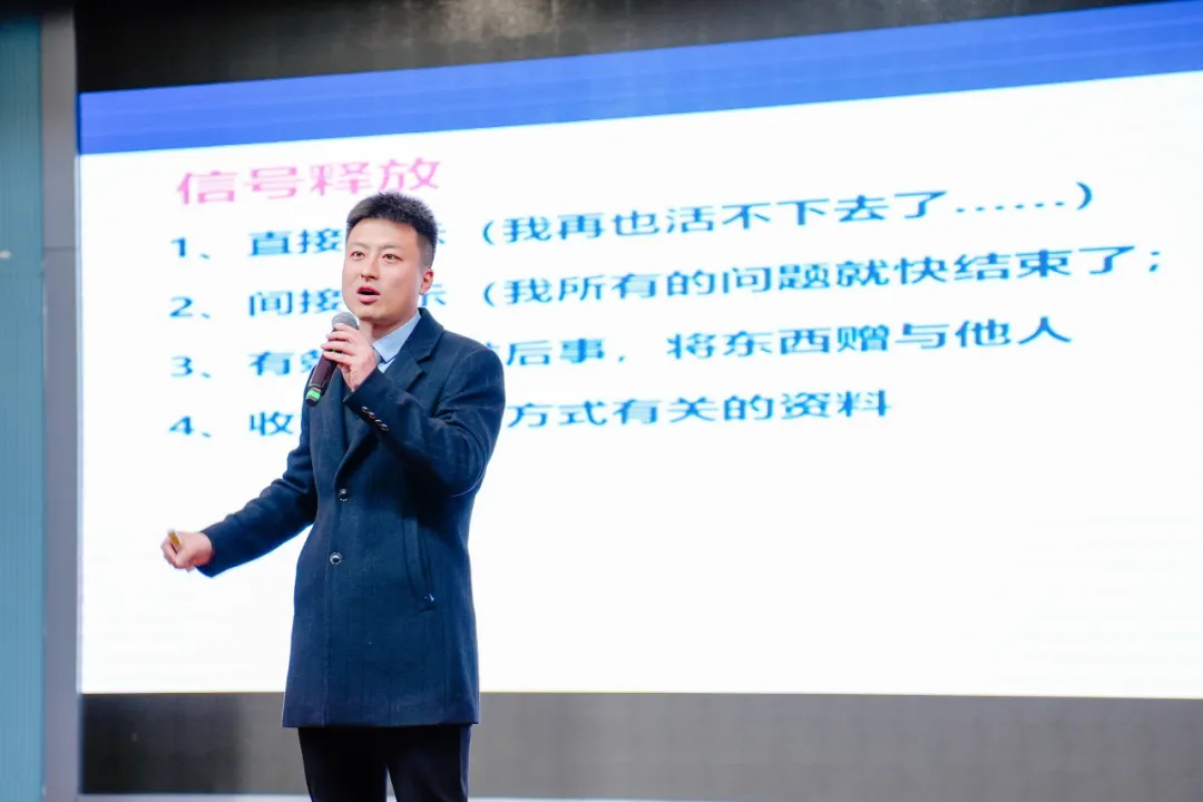 展演结束后,学生处学生心理健康教育与咨询中心汪杨皓老师带来《成为学生的“重要他人”:危机的识别与应对》专题讲座,从舞台回归现实,汪杨皓老师系统梳理了心理危机的识别信号、干预阶段及常见误区,通过真实案例解析了“平静期”的危险性、“好心办坏事”的干预陷阱,深入剖析育人工作中识别信号、及时干预的实践智慧,为现场师生提供了清晰的理论指导和实操技术。