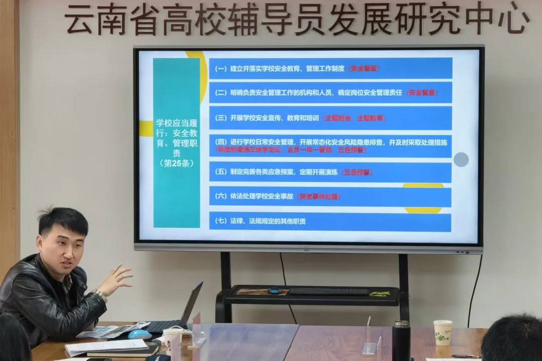 “聚思”辅导员工作室主持人分享了《云南省学校安全条例》的学习体会,深入浅出解读“条例”的核心要义,并结合学生工作实际重点讲解了重要条款,为辅导员精准把握“条例”要求、规范开展安全工作提供了清晰指引。